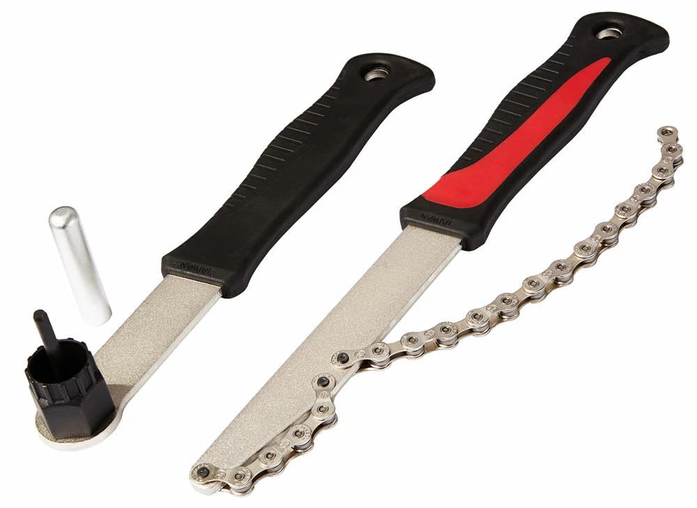 Il est équipé d’un adaptateur en aluminium de 12 mm et d’une broche de guidage qui tient solidement grâce à la magnétisation. Le kit est complété par un fouet à chaîne robuste qui maintient la roue libre via la cassette, laquelle sert de contrepartie à la bague de fermeture et possède un filetage correspondant. C’est pourquoi un fouet à chaîne est toujours utilisé avec un outil pour anneau de fermeture (extracteur de couronne/cassette) pour démonter la cassette.