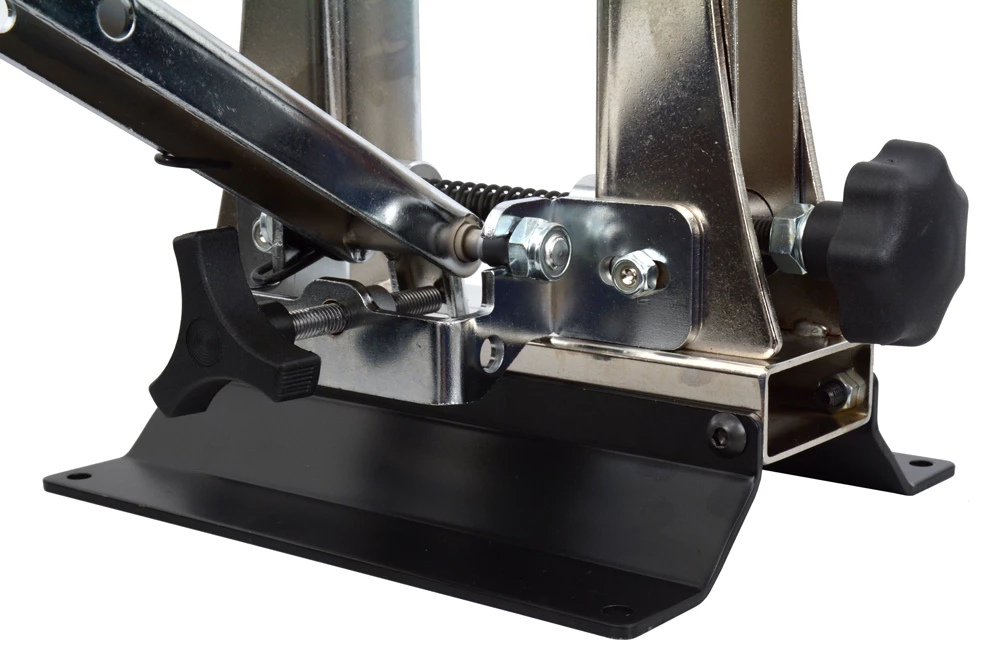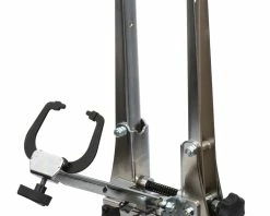 Il est également possible de fixer le support à l’établi à l’aide de vis. Le serrage du moyeu, le réglage des bras de centrage et de la potence s’effectuent à l’aide de boutons manuels ergonomiques.